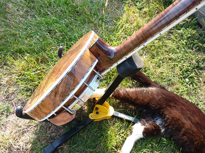 Banjo vzniklo jako dárek k šedesátinám, proto je hodně zdobené - gravírování, tygrovaný javor, ořechová kořenice, lemování bílý plast + dřevěné marquetry, barevný abalon na hlavě. Ale dá se postavit i v levnější variantě, kde není tak zdobené, ale užitné vlastnosti zůstávají stejné.